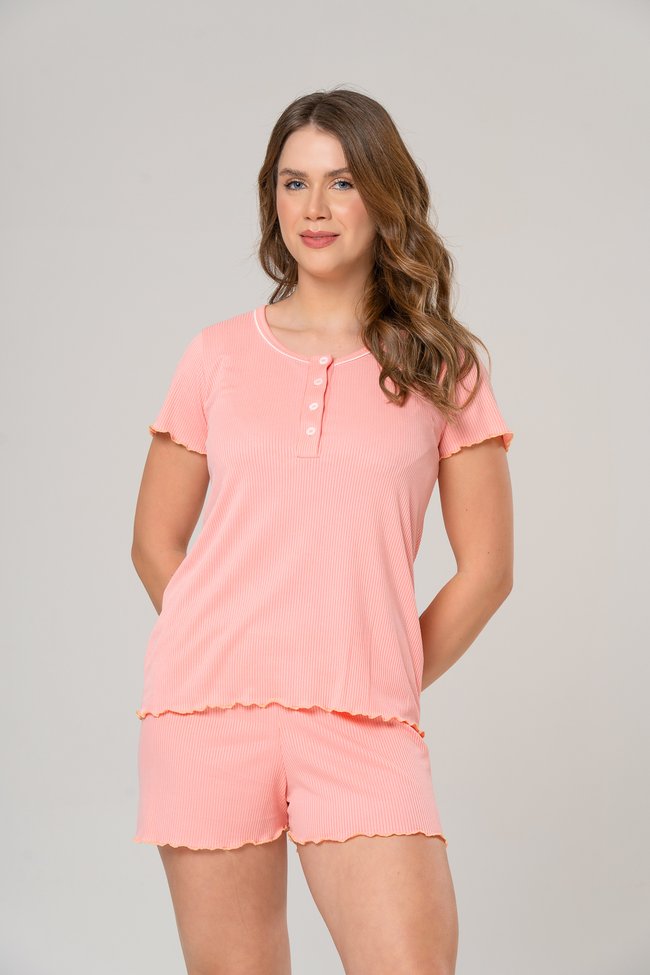 O pijama Luara é confeccionado em pele de pêssego canelada, um tecido de toque ultra macio e aveludado, que transforma suas noites em momentos de puro aconchego.
