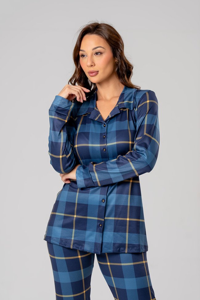 O destaque vai para seu clássico xadrez sobre fundo azul marinho,um visual atemporal que combina charme e elegância.