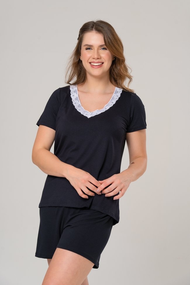 A peça é completamente lisa, com um acabamento moderno, e ganha um toque especial com o detalhe em renda branca na gola, que adiciona um toque de delicadeza e charme sutil. Simples, mas elegante, o Pijama Alana é perfeito para quem busca conforto e sofisticação em cada detalhe.