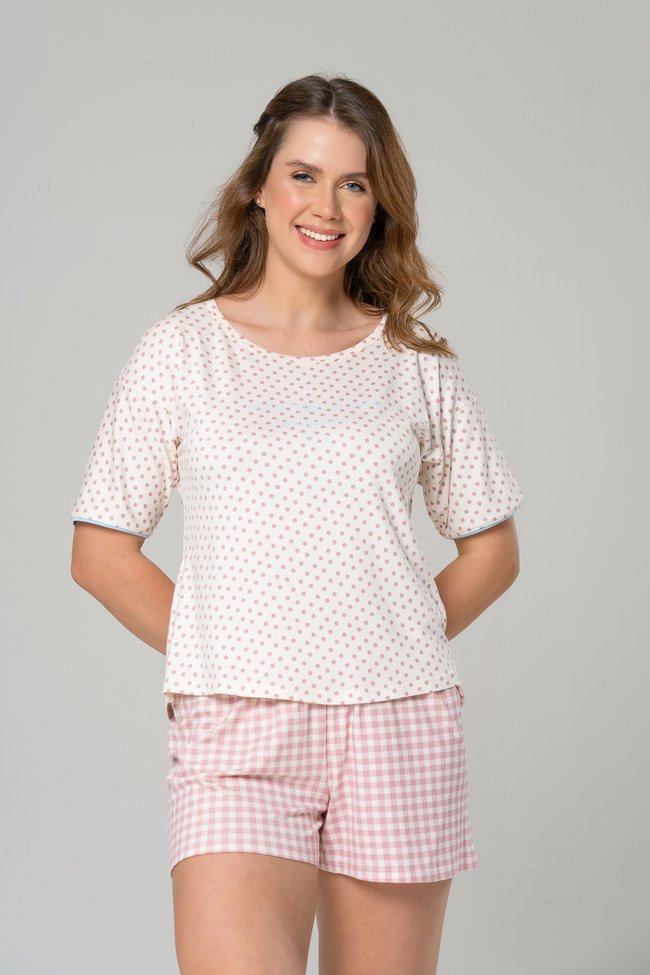 O Pijama feminino Melissa confeccionado em viscolycra, um tecido leve, extremamente macio e com excelente elasticidade, que proporciona um caimento suave e confortável sobre o corpo., ideal para quem valoriza bem-estar sem abrir mão do estilo. A blusa de poá (estampa de bolinhas clássica) traz um toque delicado e feminino, com um charmoso detalhe nas mangas que adiciona ainda mais personalidade à peça. O shorts listrado complementa o visual de forma moderna e descontraída, garantindo um conjunto harmônico e cheio de estilo.